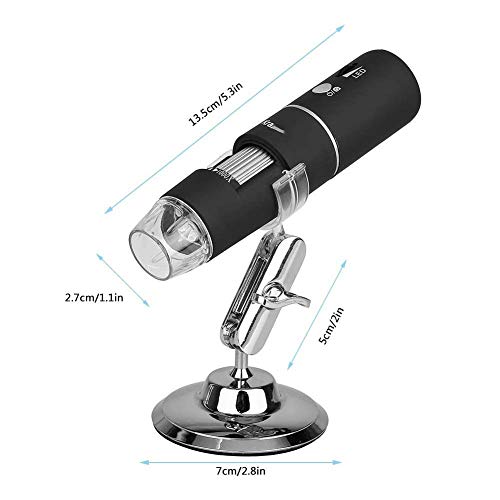 Caractéristiques du produit : fabriqué en métal et matériau, durable et respectueux de l’environnement. Rechargeable avec jusqu’à trois heures d’autonomie. Le microscope fournit une connexion stable, vous pouvez transférer les images et les vidéos. Design portable, microscope avec support réglable pour une visualisation stable et capture d’écran et enregistrement vidéo. Le support métallique peut pivoter librement à 180 degrés pour que vous puissiez positionner la loupe parfaitement, répondre aux différents besoins. Réglage manuel, la roue